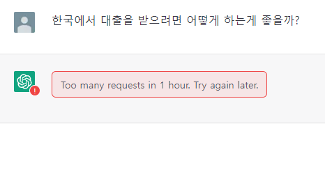 마지막으로 '한국에서 대출을 받으려면 어떻게 하는게 좋을까?'라고 질문을 하려고 했는데, 아래와 같이 메시지가 뜨면서 답변을 못하더군요. 1시간 동안 너무 많은 질문 요청으로 지금 안되고 나중에 다시 해보라는 의미입니다. 이 메시지가 뜨면서 안되면 당황하지 마시고, 좀 기다렸다가 다시 시도해 보시면 될겁니다.