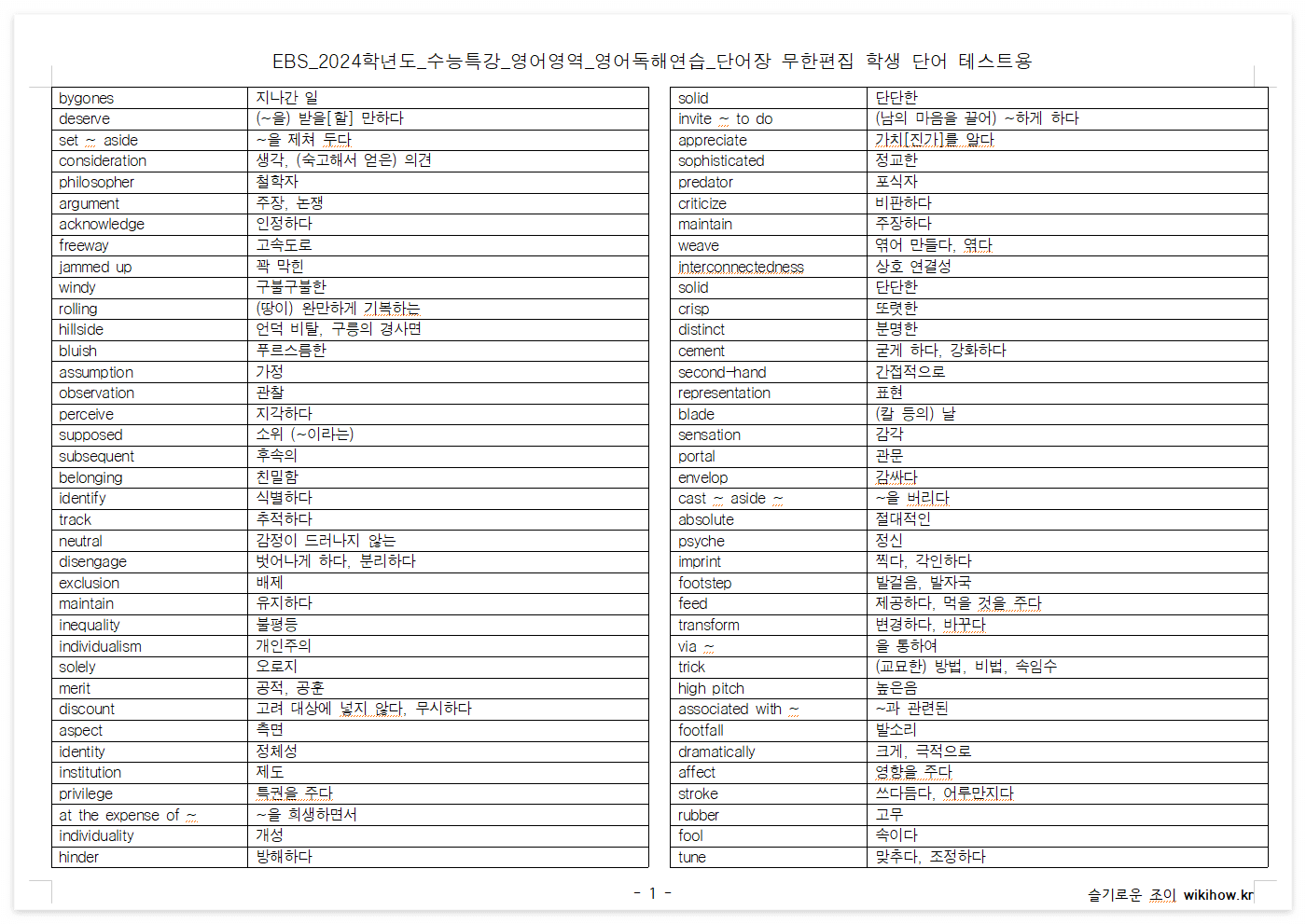 EBS 2024학년도 수능특강 영어독해연습 단어장, 무한 편집 가능, 학생 단어 테스트용