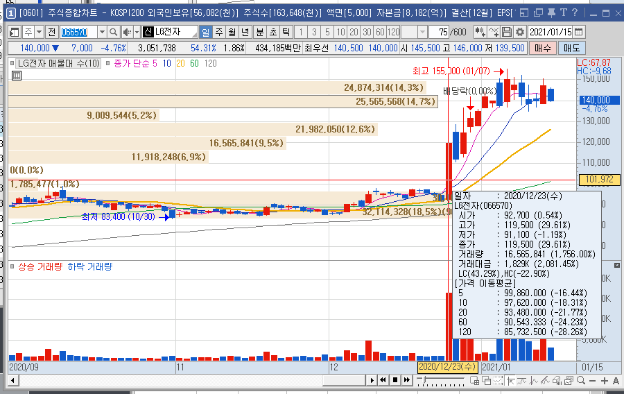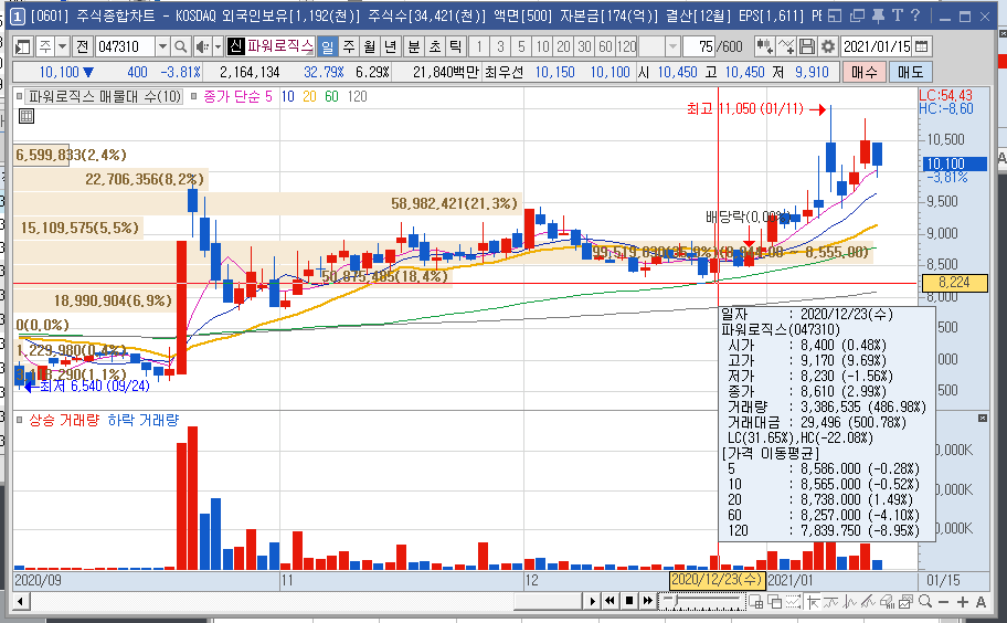 우선 파워로직스부터 보자. 위 그림에서 보듯 약 3주 쯤 전인 2020년 12월 23일 대형주인 LG전자가 사상 초유의 상한가를 찍었다. 애플이 전기차 시장에 뛰어 들겠다고 발표하면서 생긴 현상이다. 그렇다면 파워로직스는 이 LG전자와 무슨 관련이 있을까? 파워로직스는 LG화학과 삼성 SDI 등과 전기차 배터리에 필요한 PCM을 공동개발 했고 주요 공급업체로 성장을 했다. (PCM을 기술적으로 깊이 알 필요는 없고, 다만 배터리가 폭발하지 않기 위한 안전장치로만 이해하자.) 어쨌거나 애플카 이슈가 뜨면서 LG전자와 동반 상승하는 호재로 작용했다.