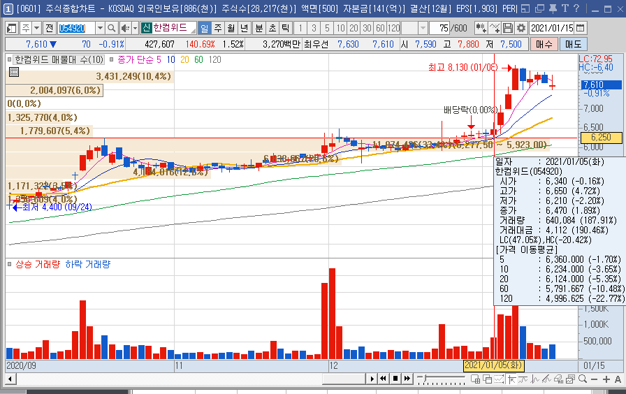 한글과 컴퓨터의 계열사인 한컴위드는 필자 개인적으로 '한컴'이라는 브랜드와 블록체인 및 데이터 암호화 기술 부분에 초점을 둔다. 올해 1월 5일 블록체인 기반 글로벌 디지털 금융사업을 위한 6자간 MOU 체결 소식 이후, 가파른 상승세를 보인다. 또, 오늘자 뉴스를 보면 한컴그룹에서 블록체인 기반의 HTC(한컴 토큰)을 공개할 예정이며, 기술적으로 뭔 뜻인지는 정확히 알 순 없으나, '탈중앙화 디지털 금융 플랫폼'을 통해 금융관련 상품 출시를 가시화하고 있다고 한다. 앞으로 충분히 성장 가능한 회사라고 판단한다. 파워로직스, 한컴위드 두 회사 모두 아직은 저평가 된 점과 재정적으로 탄탄한 회사라는 것이 큰 매력으로 다가온다.