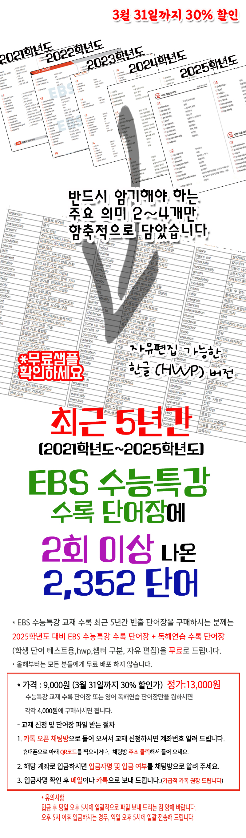 | 2025학년도 EBS 수능특강 영어 단어장(상세), 학생 테스트용, 자유편집 한글(HWP)버전 판매 (464) | 2024.03.12 |
