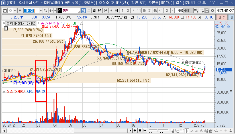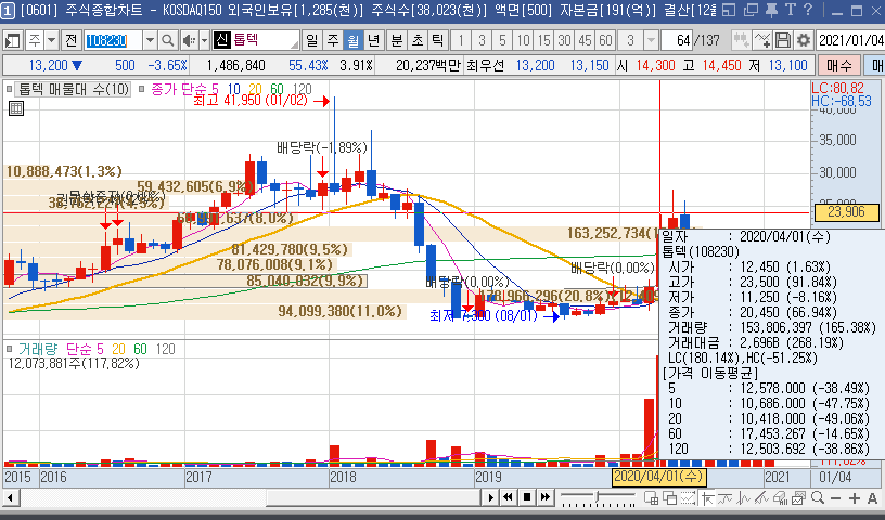 이 종목에 대해서는 좀 더 지켜 보면서 기본적 분석을 해 봐야겠지만, 자본금 191억원의 우량기업이라는 점과 최근 들어 작년 3분기부터 매출이 다시 상승하고 있으며, 영업이익도 적자에서 흑자로 전환이 되고 있어 꽤 매력적인 종목으로 보인다. 앞으로 2,3심 검찰의 항소가 남아 있을 테지만, 이 종목이 기사회생할 수 있을 것이라고 기대해 본다.