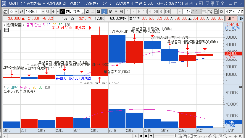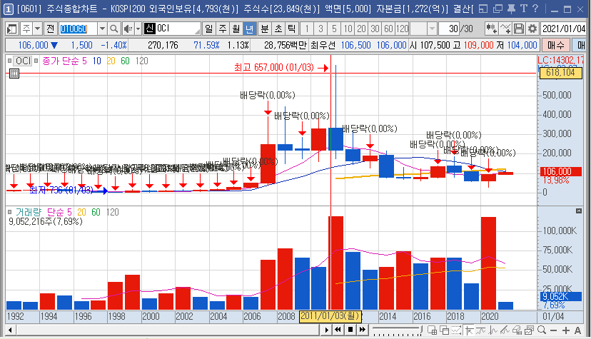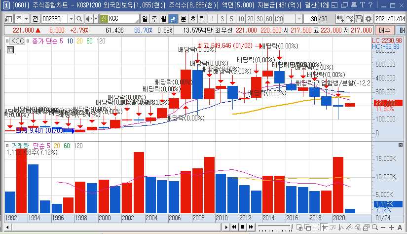 모두 한 때 잘 나가던 튼튼한 회사들이다. 다 찾아보지 않아서 잘 모르겠지만, 몇 년 또는 십 년 정도 사이에 반토막, 아니 반의 반토막 이상을 간 종목도 있다. 그렇게 된 원인에 대한 분석은 다음을 기약하자. 앞서 말한 것처럼 이런 종목들은 하루아침에 급락하거나 급등하는 경우는 매우 드물지만 장기투자를 한 사람의 경우 큰 손실을 볼 수 있는 케이스다.