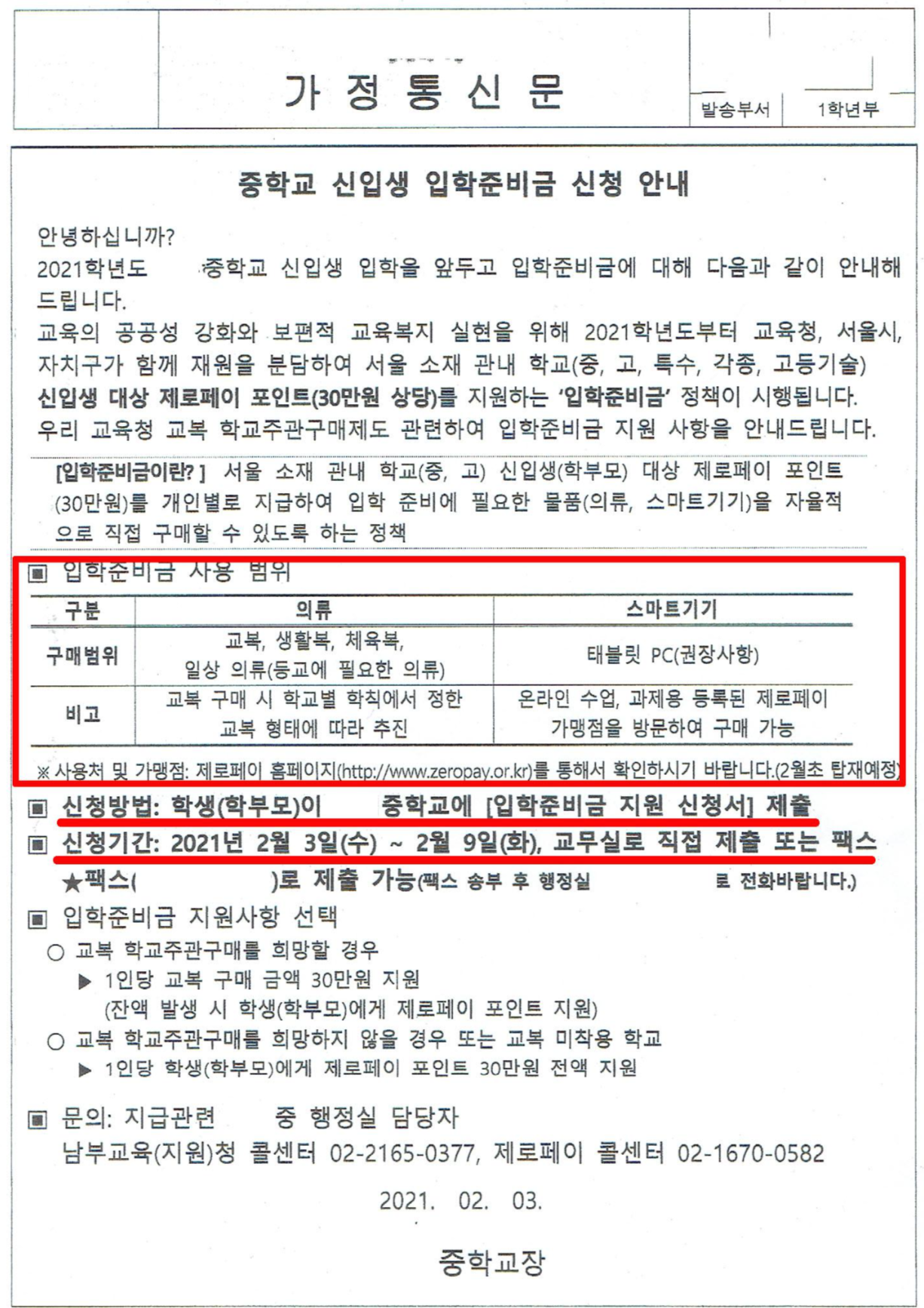 '총 지원금액은 30만원이고, 교복을 포함해 생활복, 체육복, 일상복을 살 수 있고, 제로페이 가맹점에서 태블릿 PC 사는데 보탤 수도 있다. 학교에서 주관하는 교복 구매 방식을 선택하거나, 입학준비금 전액을 제로페이 포인트로 받아서 개별적으로 구매할 수 있다. 신청서에 입력한 전화번호로 제로페이 포인트가 충전될 것이다.'