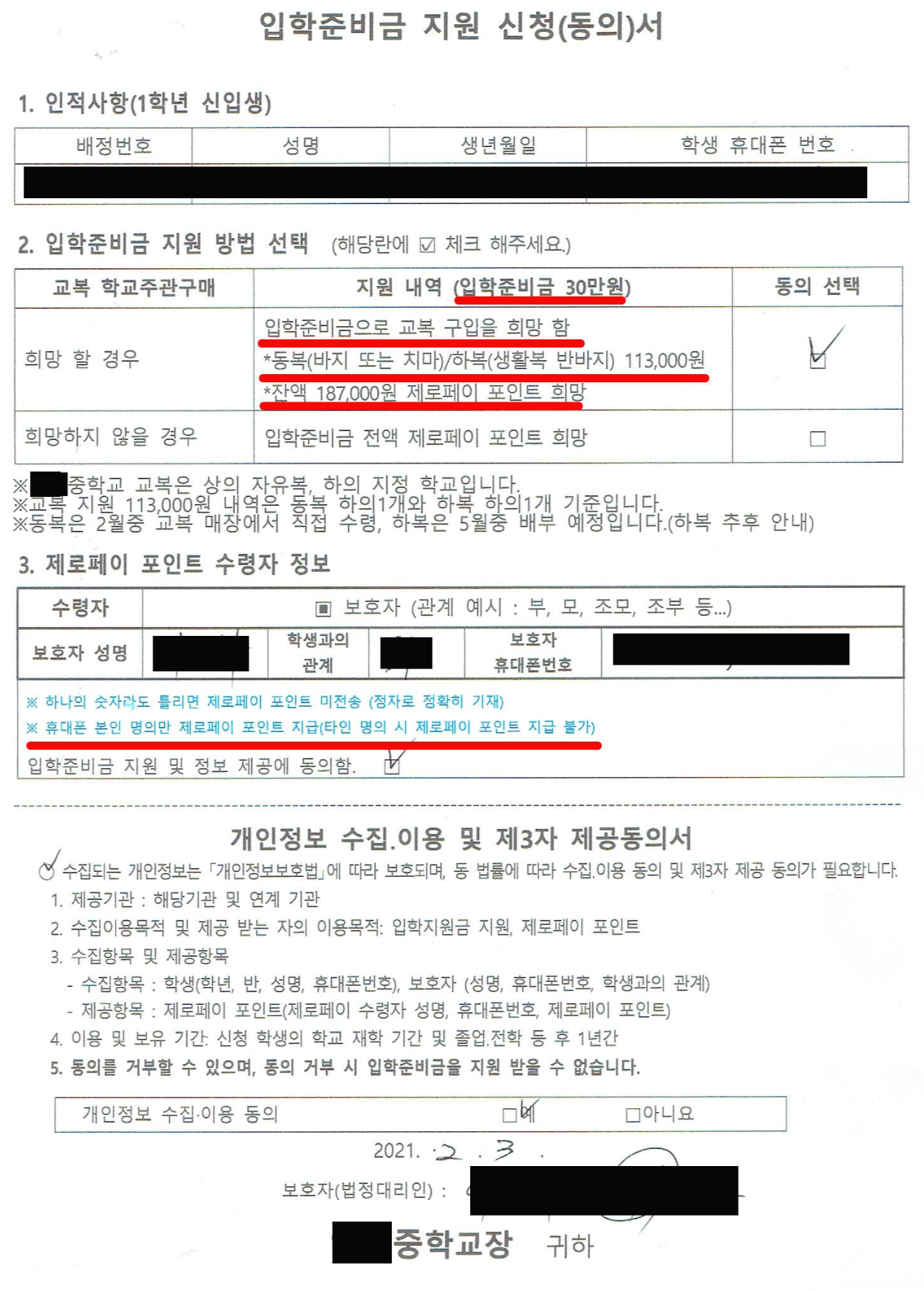 올해 중,고등학교 1학년에 입학할 자녀가 있는 학부형은 학교로부터 위와 같이 '가정통신문'과 함께 '입학준비금 신청서'를 받을 것이다. 퇴근하고 와서 이런 류의 처음 보는 문서를 받으면 조금 당황스럽긴 해도 별거 없다. 붉은색으로 그어진 부분과 박스 친 부분만 유의해서 보면 된다.