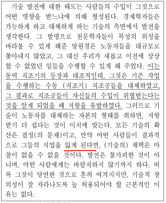마치 1800년대 초 영국의 산업혁명에 반발하여 일어난 '러다이트 운동(Luddite)' 지지하는 사람들의 주장 같다. 요즘 같이 기술 발전이 중요한 시대에 무슨 소리냐 할 수 있을 테지만, 수능이나 모의고사에 나오는 지문은 다양한 시대, 다양한 사람들의 의견과 목소리를 담으려고 노력하는 것 같다.