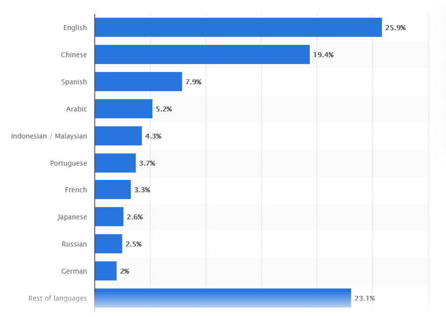As of January 2020, English was the most popular language online, representing 25.9 percent of worldwide internet users.