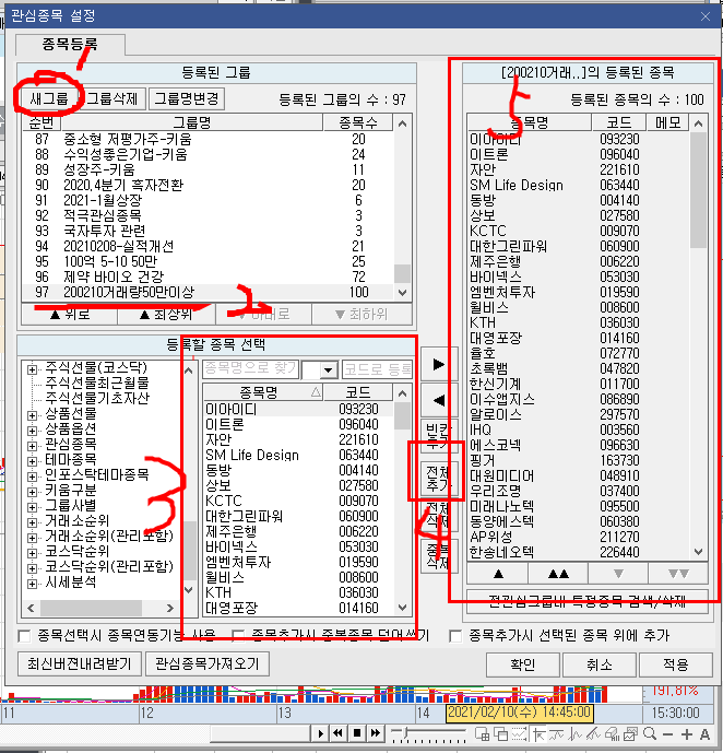 그러면 위처럼 관심 목록 설정이라는 팝업창이 하나 더 뜨는데, 3번 박스에서 보는 것처럼 좀 전에 보이던 리스트가 들어가 있는 것을 볼 수 있다. 그런 다음 숫자 1번에 '새그룹' 클릭, 2번에서 그룹 이름을 정하고 4번의 '전체 추가' 버튼을 누르면 5번처럼 내가 원하는 목록이 다 들어가는 것을 볼 수 있다. 마지막으로 '확인' 버튼 클릭!