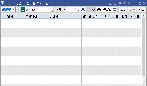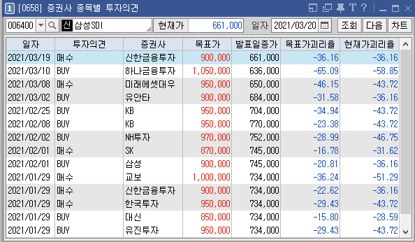 초보 투자자는 고수들에 비해 아무래도 정보수집력이 부족할 수밖에 없다. 이런 의미에서 어떤 종목을 선택해야 할지 고민이 될 때 전문가의 의견을 참고하는 것도 좋은 방법이다. 전문가는 세상에 너무나도 많지만 가장 우리가 쉽고 편하게 접할 수 있는 자료는 각 증권사 HTS에서 제공하는 투자의견이 아닐까 생각한다. 필자가 쓰는 키움증권 HTS에 '증권사 종목별 투자의견(0658)'이라는 서비스가 있는데, 각 증권사들이 종목별 목표가를 책정해 두었다. 필자가 최근 관심을 두고 있는 몇 종목들의 증권사별 목표가를 한번 보자.