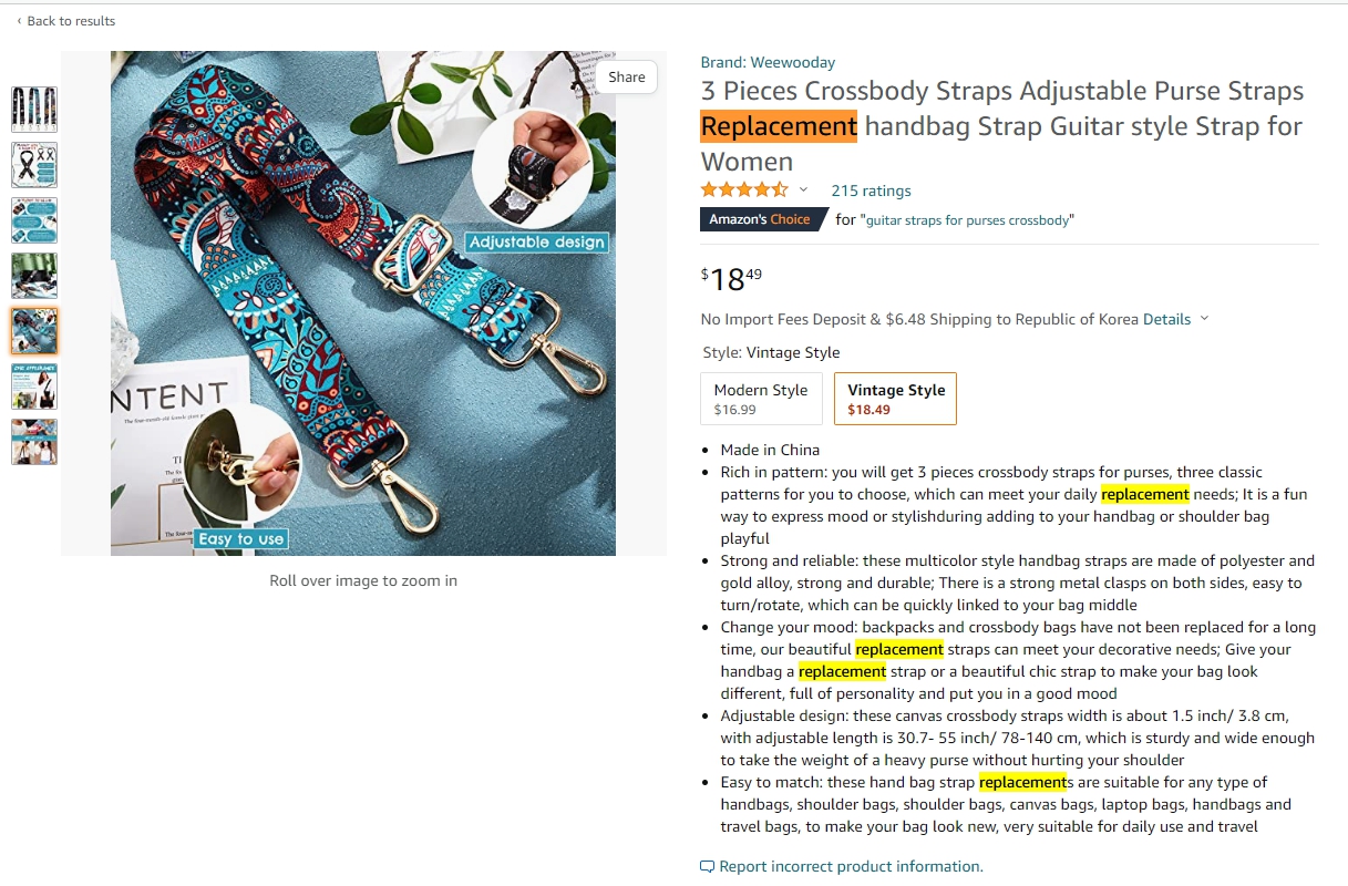 아마존에서 핸드백 줄(purse strap)이라고 검색하면 아래와 같은 상품들이 뜬다. 여자 핸드백은 'handbag '이라고도 하지만, 'purse'라는 단어도 즐겨 쓴다. 아래에 보이는 제품에 들어가 보면 'replacement'라는 단어가 보인다. 다른 포스팅에서도 언급했듯이, 끈 길이가 조절 가능하다면 'adjustable'이라는 단어를 쓰기도 한다.