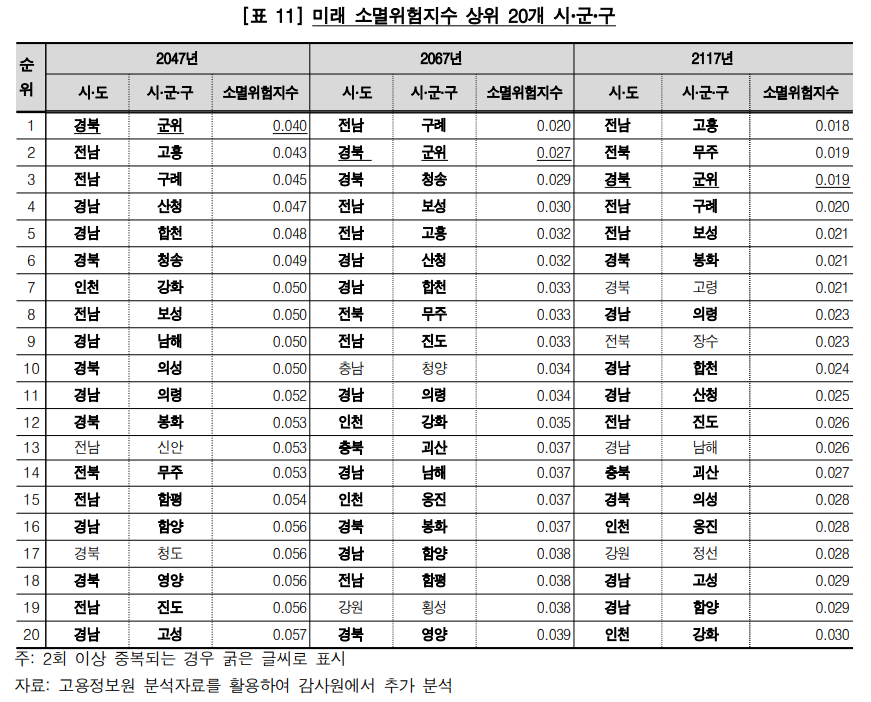 2023년 현재부터 24년후를 기준으로 소멸위험이 가장 높은 곳은 경북 군위, 전남 고흥, 전남 구례 순으로 나타납니다. 시간이 지날수록 순위가 조금씩 변하기는 하는데, 거의 비슷하게 통계가 나옵니다. 중복되는 곳은 짙은 색으로 표시했네요.