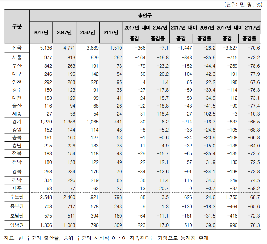 2047년, 2067년, 2117년 대한민국 인구는?