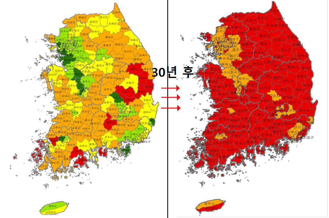 아래의 대한민국 지도는 무엇을 의미할까요?