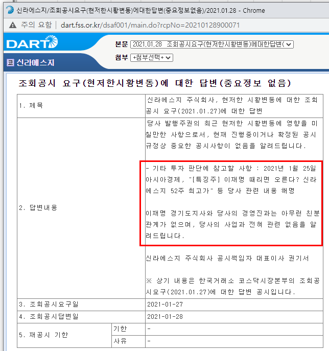 위에 서 본 '신라에스지'는 단기간에 너무 많이 주가가 올라서 '투자경고'를 받은 경우다. 정치테마주는 특정 인물이 주목을 받는 경우, 아무 근거 없이 주가가 급등하기도 하는데, 신라에스지의 경우, 지난 1월 25일 한 기사로 인해 자사의 주가가 폭등한 이유를 실제 특정인물과 관련이 없다고 공시했다.