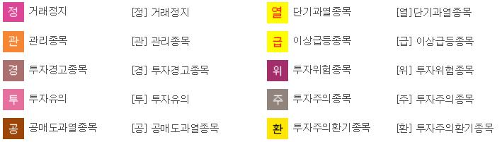 필자는 다른 HTS를 한 번도 안 써봐서 잘 모르겠지만, 키움증권 영웅문의 경우 아래와 같이 회사 이름(종목명) 옆에 무슨 글자 같은 게 붙어 있는 경우를 보게 된다. 주식 초보자들은 이걸 무심코 지나가는 경우가 많은데, 아주 중요한 내용이라 반드시 눈여겨봐야 하는 사항이다. 특히, '관리종목', '투자주의 환기종목', '거래정지' 같은 경우에는 자칫 상장폐지로 이어질 수도 있어서 투자에 있어 각별한 주의가 필요하다.