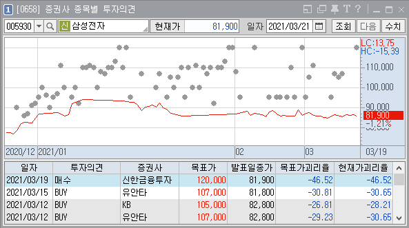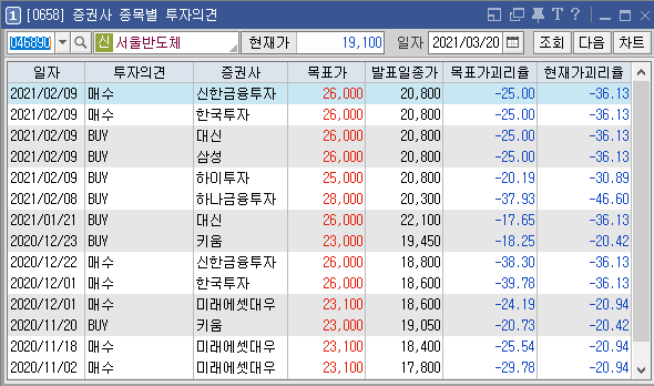 위 종목은 서울반도체라는 종목인데, 최근 한달정도는 분석자료가 없는지 지난 2월 9일까지의 자료만 있다. 목표가를 설정할 만한 충분한 자료가 없어서 목표가 설정이 어려워서 그럴 것이다.