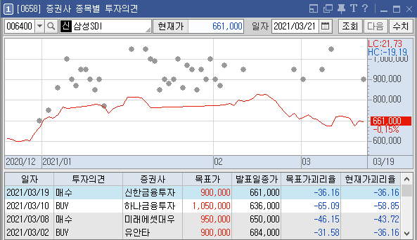 초보 투자자는 고수들에 비해 아무래도 정보수집력이 부족할 수밖에 없다. 이런 의미에서 어떤 종목을 선택해야 할지 고민이 될 때 전문가의 의견을 참고하는 것도 좋은 방법이다. 전문가는 세상에 너무나도 많지만 가장 우리가 쉽고 편하게 접할 수 있는 자료는 각 증권사 HTS에서 제공하는 투자의견이 아닐까 생각한다. 필자가 쓰는 키움증권 HTS에 '증권사 종목별 투자의견(0658)'이라는 서비스가 있는데, 각 증권사들이 종목별 목표가를 책정해 두었다. 필자가 최근 관심을 두고 있는 몇 종목들의 증권사별 목표가를 한번 보자.